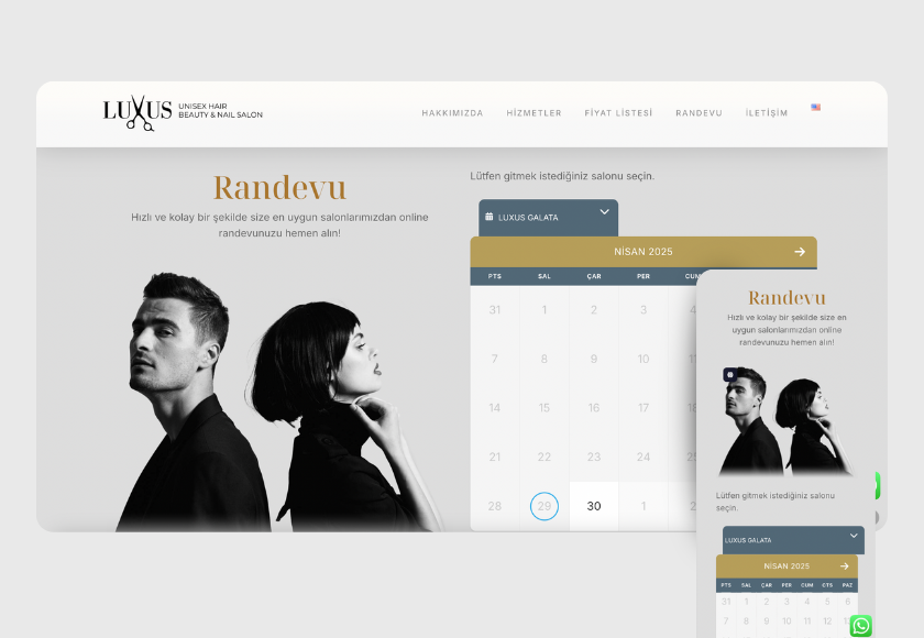 LUXUS Beauty için kullanıcıların kolayca randevu oluşturabileceği mobil uyumlu bir web arayüzü geliştirdim. Lokasyon seçimi, uygun saat filtreleme ve net arayüz yapısıyla kullanıcı deneyimini sadeleştirdim. Hem masaüstü hem mobilde pratik kullanım sağlayan bir sistem kurguladım.