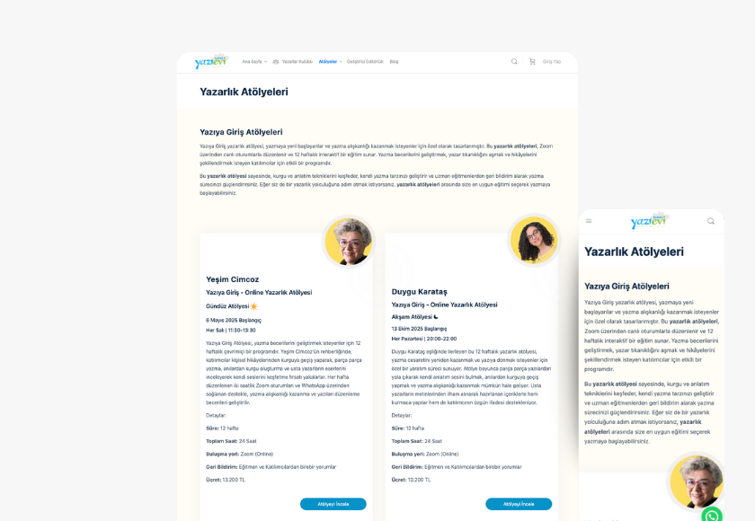 Yazıevi için kullanıcı deneyimini önceleyen, sade ve okunabilir yapısıyla öne çıkan bir atölye sayfası hazırladım. Atölye türü, eğitmen bilgisi ve detaylar kolayca erişilebilecek şekilde yapılandırıldı. SEO açısından da güçlü anahtar kelimelerle desteklenen içerik yapısıyla Google görünürlüğü artırıldı.