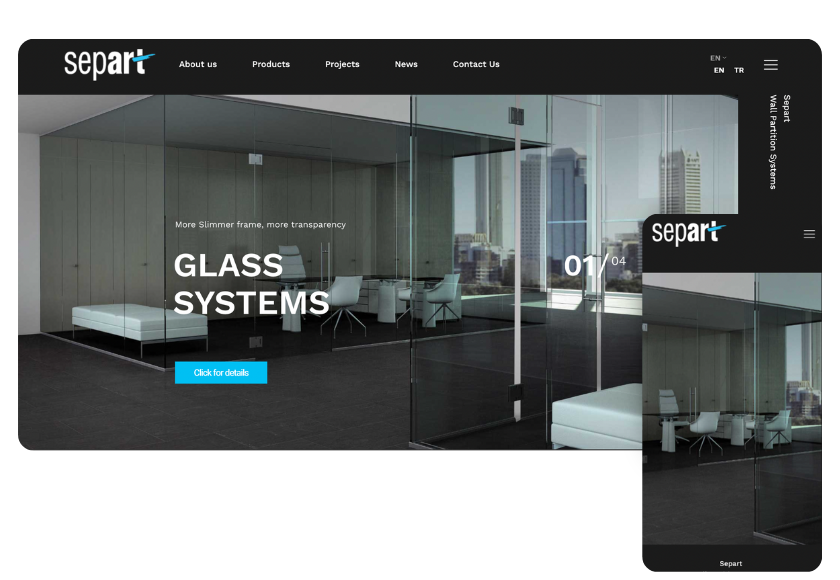 Separt Glass Systems için sade ve modern bir kurumsal web arayüzü tasarladım. Ürün odaklı bir yapı kurarak ziyaretçilerin ürün detaylarına hızlıca erişebilmesini sağladım. Duyarlı tasarımıyla hem mobil hem masaüstü cihazlarda kusursuz bir görünüm sunuyor.